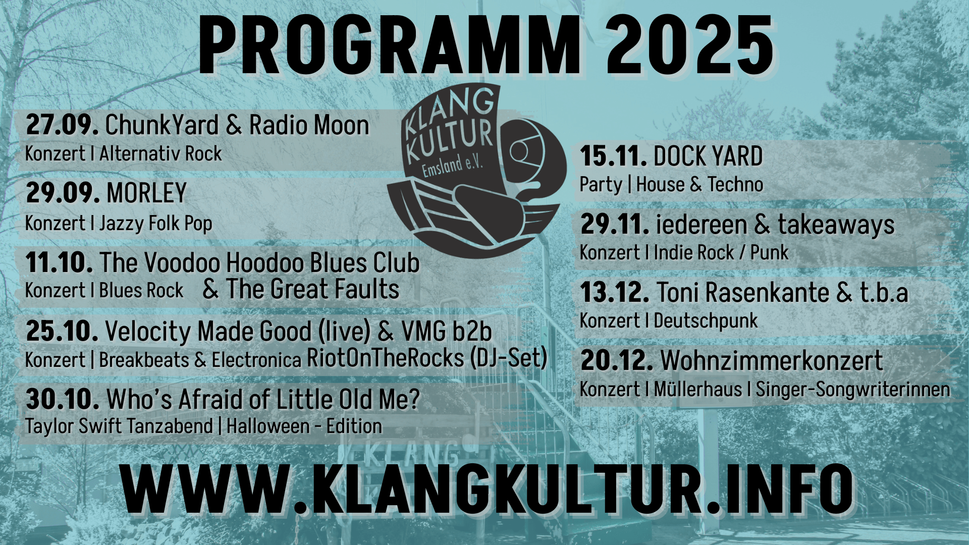 Seit 2013 veranstalten wir Konzerte, Festivals und andere kulturelle Veranstaltungen in und um Haren (Ems) und seit 2018 auf unserem Kulturschiff Blaue Donau.